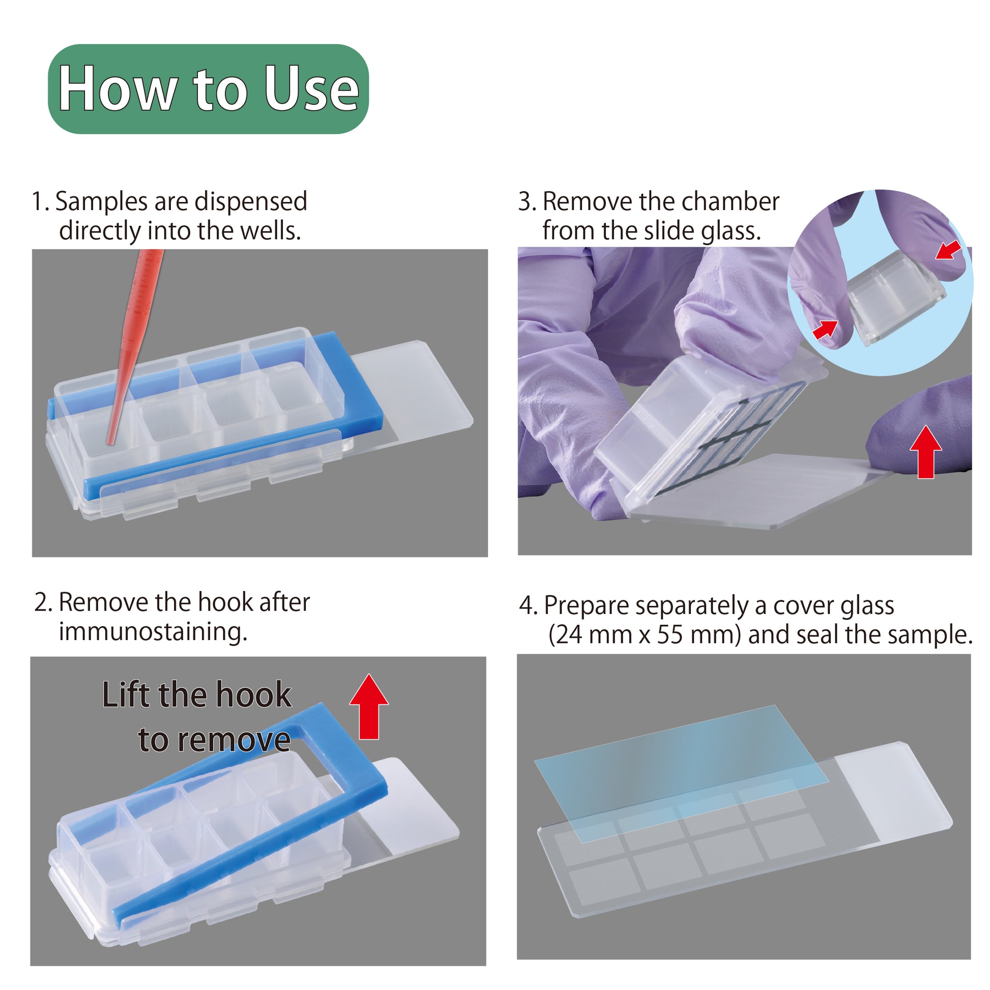 ① Firstly, prepare for the sample and check it is sticked on the slide glass before use. Then, incubate the cells with the appropriate amount, and apply immunostaining.